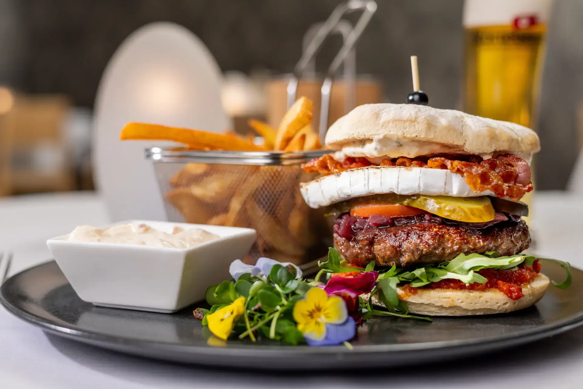 Zirkower Bio-Rind (180g) mit Bacon, Camembert, Zwiebeln, Tomaten-Confit, Steak House Pommes & hausgemachtem Dip